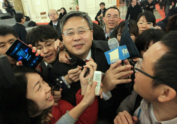 3月5日,北京,十二届全国人大一次会后,在大会堂北大厅通道证监会主席遭大量记者围堵时艰难突围。