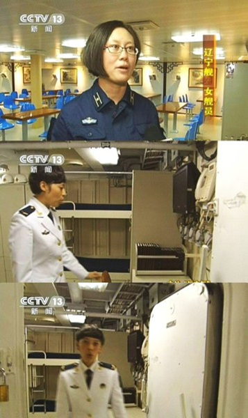 2012年9月30日晚央视播出的新闻面对面节目,详细介绍了中国首艘航母的女舰员生活区、生活设施和官兵食堂。